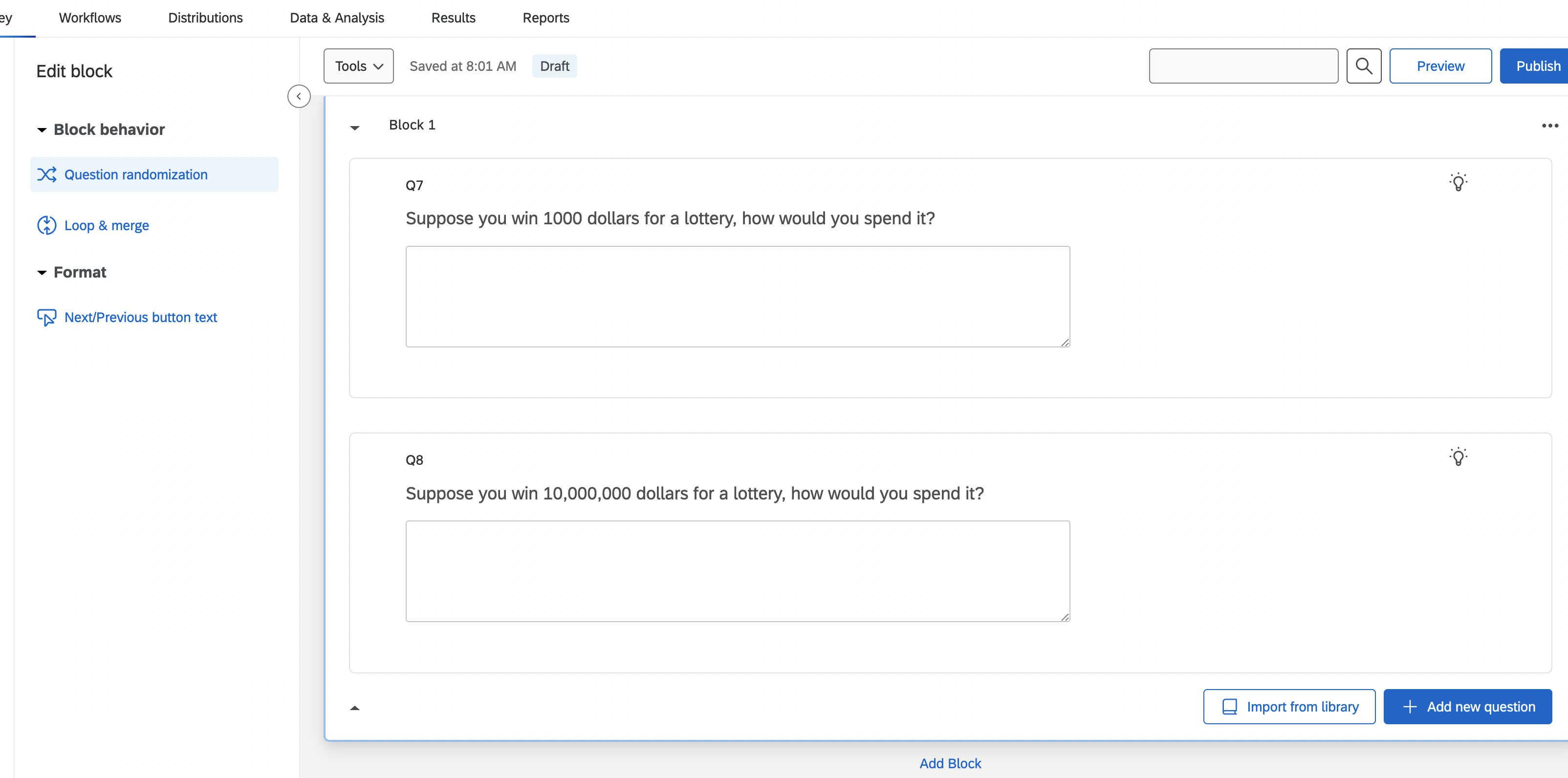 The last step is to make sure that the questions from this block are sampled randomly for each respondent, and that only one of these questions will be selected. We can achieve this by editing the block’s options. Click the block and select the Question Randomization option one the left.