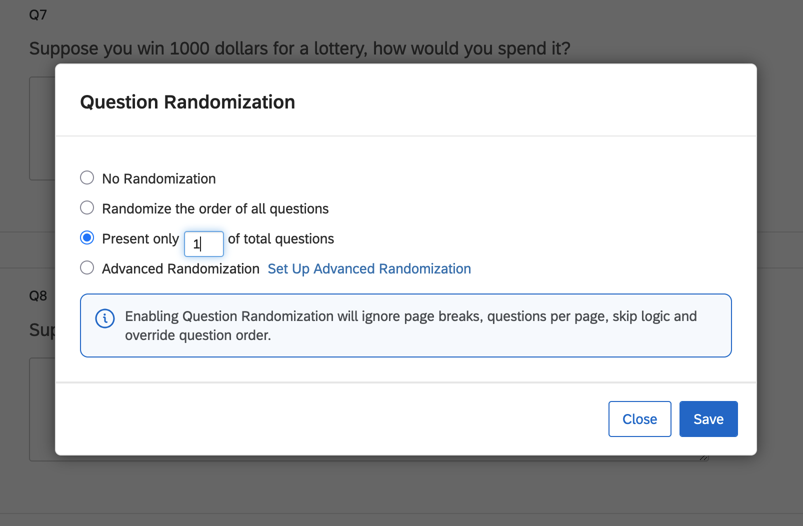 This should pull up the Question Randomization menu. We can choose: no randomization, to randomize the order of questions, or to randomly select N questions from the block to present to the respondent. Select the last optin and set the number to 1 and we will have our first survey experiment.