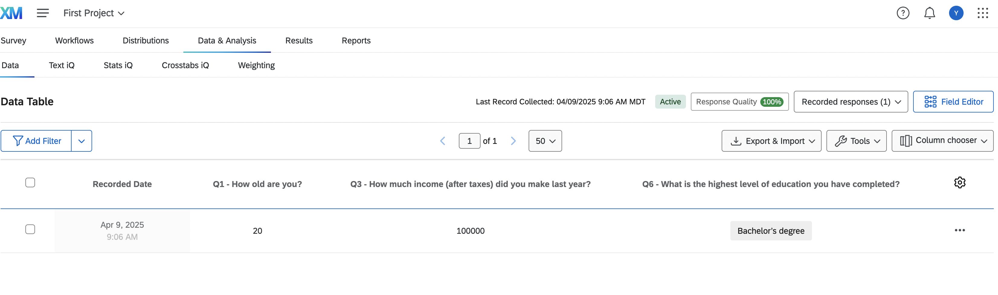 When someone responds to your survey, inside the Data and Analysis pane in Qualtrics, you should see a response!