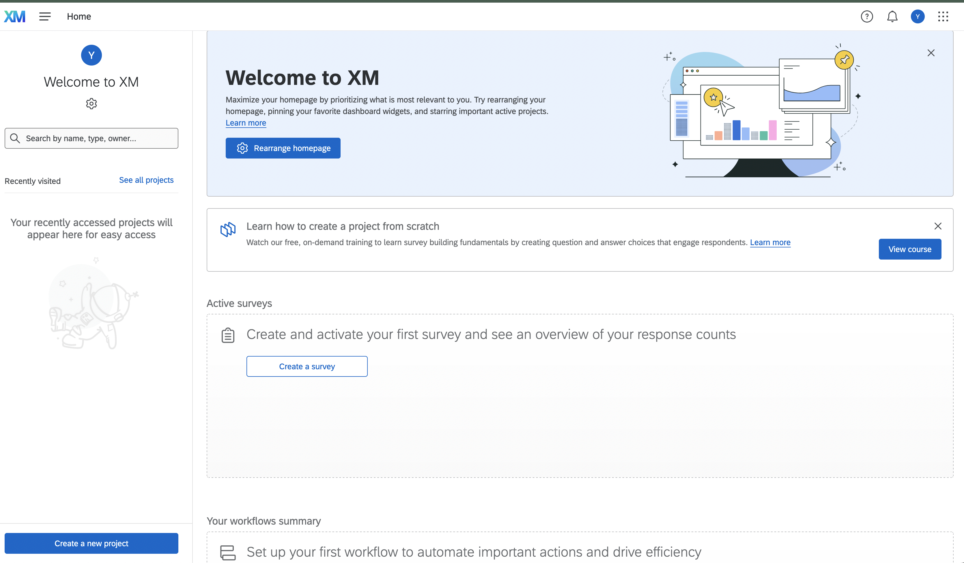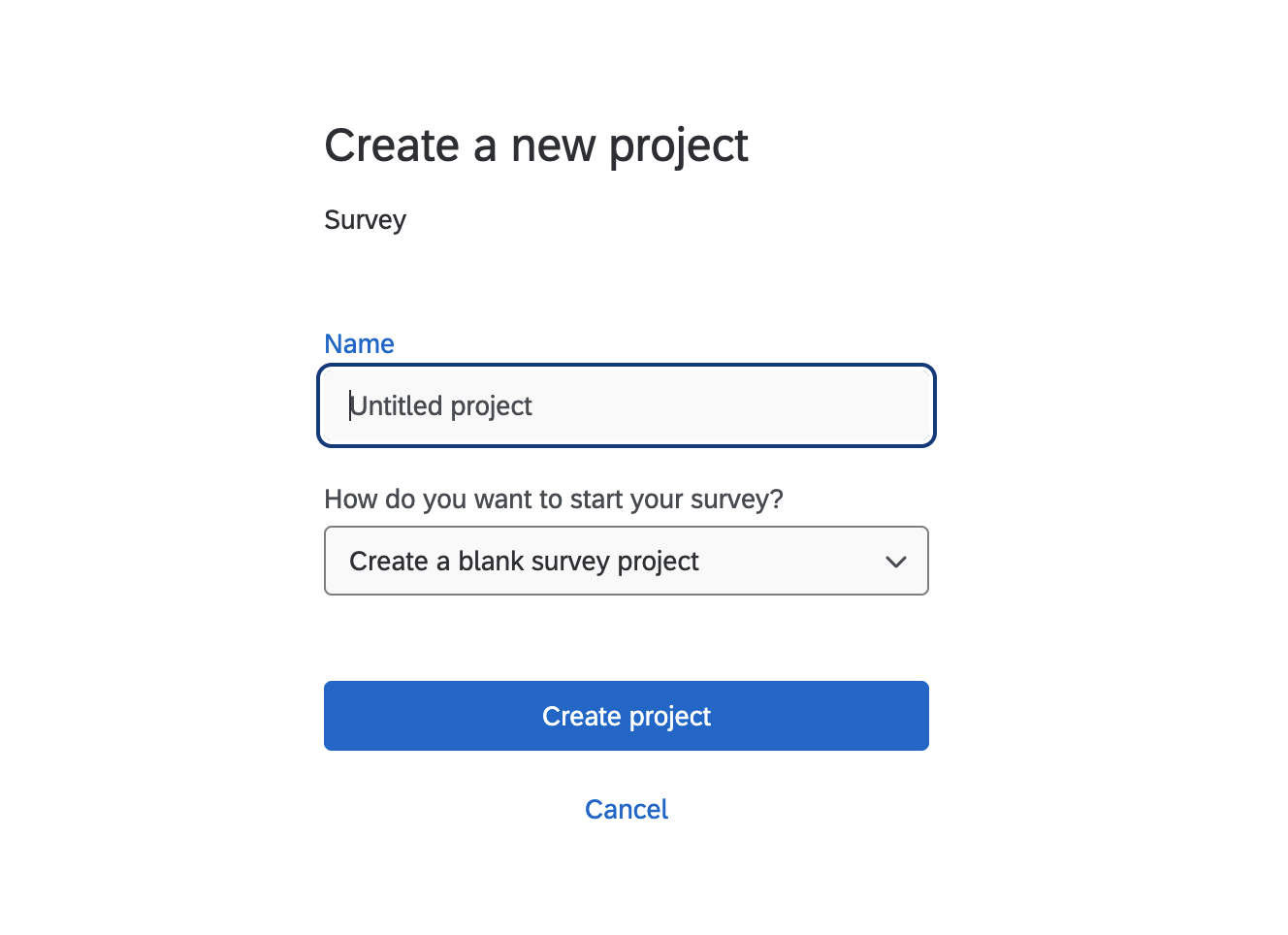 Now you should be into Qualtrics! Since you haven’t made a project previously, you only have one option: Create a new project (bottom left). Everytime you want to make a new survey you will click this button. We will make an example survey to show you the ropes.