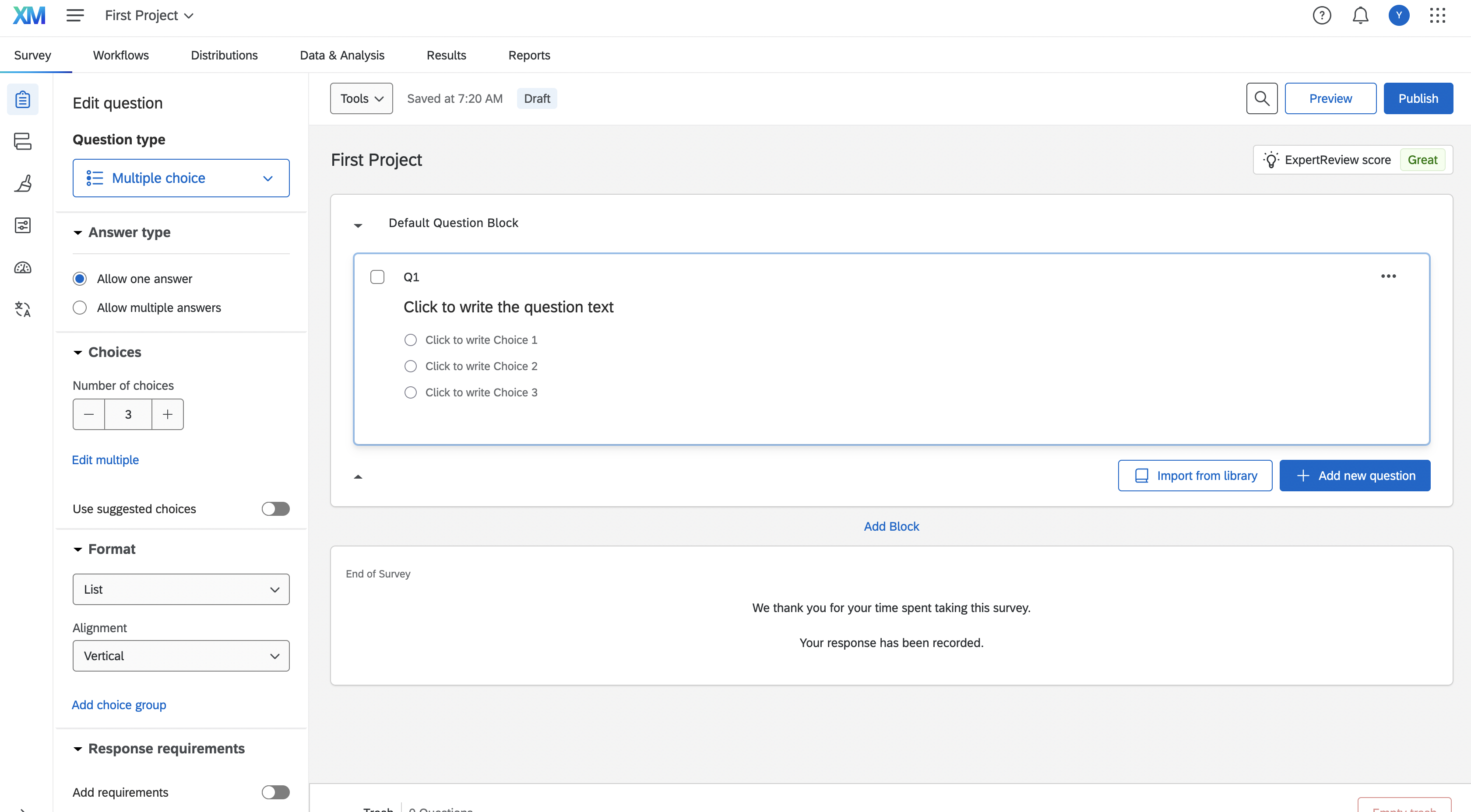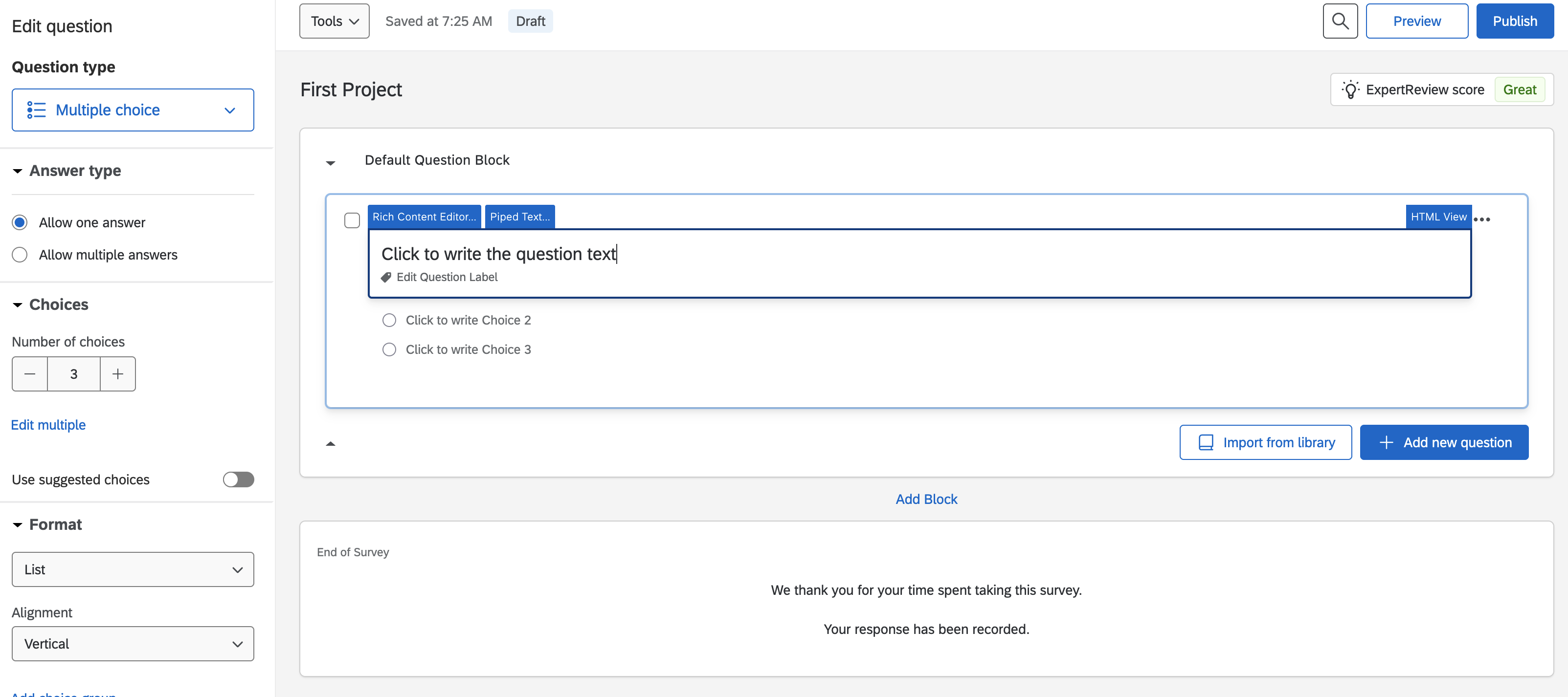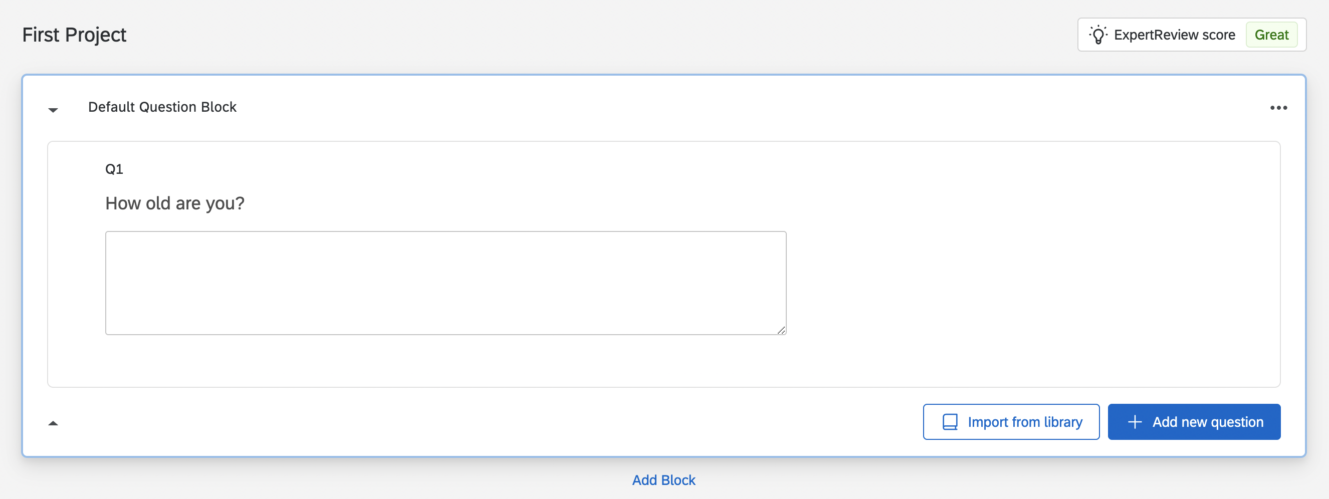 With a project created, we have been ported to Qualtric’s main user interface, where we can build a survey. Have a look around at all of the different options. Qualtrics is full of tools for creating your ideal survey, but at times that functionality can be a bit overwhelming.